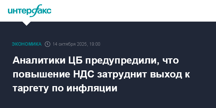 Москва. 14 октября. INTERFAX.RU - Увеличение ставки НДС усложнит путь к целевому уровню инфляции в 2026 году, однако альтернативный способ поддержания бюджетных расходов потребовал бы от Банка России ужесточения денежно-кредитной политики, считают аналитики Банка России.