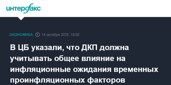 Москва. 14 октября. INTERFAX.RU - Денежно-кредитная политика (ДКП) в условиях наложения нескольких разовых временных проинфляционных факторов в первую очередь должна принимать во внимание их кумулятивное влияние на процесс снижения инфляционных ожиданий. Об этом говорится в бюллетене "О чем говорят тренды", подготовленном департаментом исследований и прогнозирования ЦБ РФ.