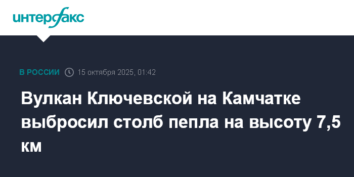 Москва. 15 октября. INTERFAX.RU - Вулкан Ключевской на Камчатке в среду утром выбросил столб пепла на высоту до 7,5 км над уровнем моря, сообщает Камчатская группа реагирования на вулканические извержения (KVERT) Института вулканологии и сейсмологии дальневосточного отделения РАН.