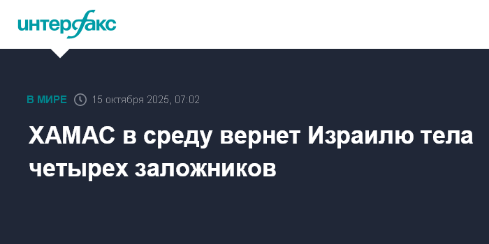Москва. 15 октября. INTERFAX.RU - Палестинское движение ХАМАС намерено передать тела еще четверых заложников Израилю в среду, сообщает The Times of Israel со ссылкой на осведомленные источники.