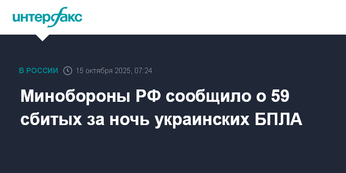 Москва. 15 октября. INTERFAX.RU - Минобороны РФ заявило, что за ночь уничтожены и перехвачены 59 украинских беспилотников самолетного типа.