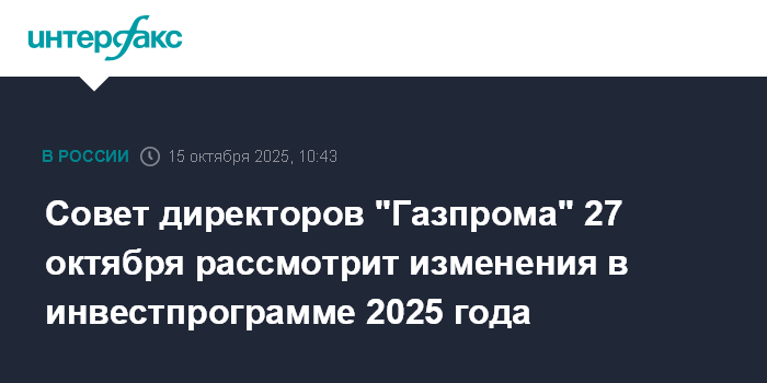 Совет директоров "Газпрома" 27 октября рассмотрит изменения в инвестпрограмме 2025 года