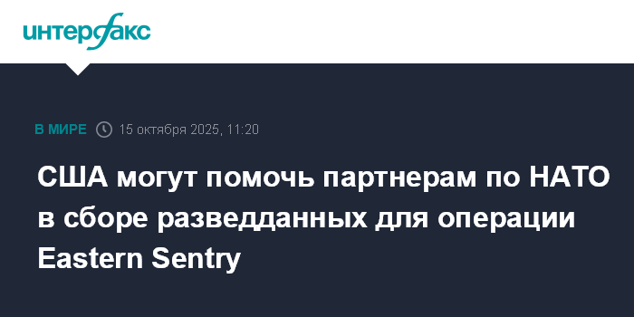 Москва. 15 октября. INTERFAX.RU - США могут оказать содействие союзникам по НАТО в сборе разведывательных данных для операции Eastern Sentry, сообщает Politico со ссылкой на источники.