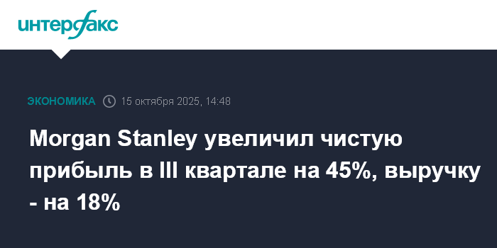 Москва. 15 октября. INTERFAX.RU - Morgan Stanley, один из крупнейших банков США, увеличил чистую прибыль в третьем квартале 2025 года на 45%, выручку - на 18%, до рекордного уровня.