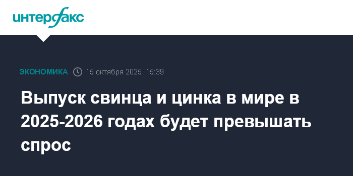 Москва. 15 октября. INTERFAX.RU - Производство свинца и цинка в мире будет превышать спрос в 2025 и 2026 годах, прогнозирует Международная исследовательская группа по свинцу и цинку (ILZSG).