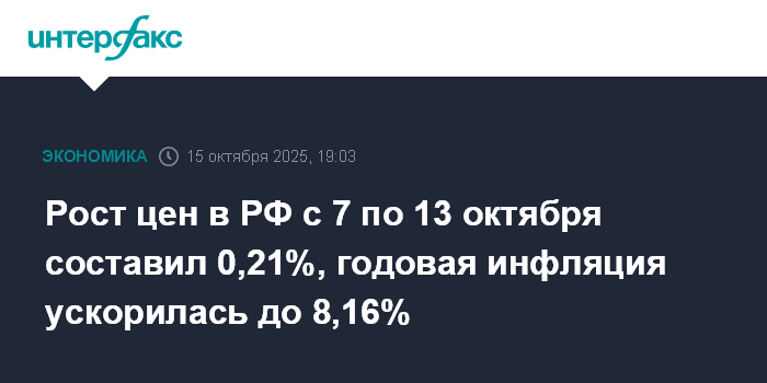 Рост цен в РФ с 7 по 13 октября составил 0,21%, годовая инфляция ускорилась до 8,16%