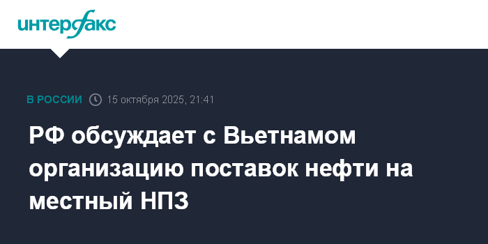 Москва. 15 октября. INTERFAX.RU - Россия ведет переговоры с Вьетнамом по организации перспективных поставок нефти на местный НПЗ для увеличения товарооборота между странами, говорится в сообщении правительства РФ по итогам встречи вице-премьера Александра Новака с заместителем премьер-министра Вьетнама Буй Тхань Шоном на полях Российской энергетической недели (РЭН-2025).