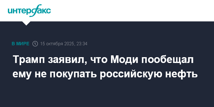 Москва. 15 октября. INTERFAX.RU - Президент США Дональд Трамп заявил, что премьер Индии Нарендра Моди сообщил ему о готовности прекратить покупку российской нефти.