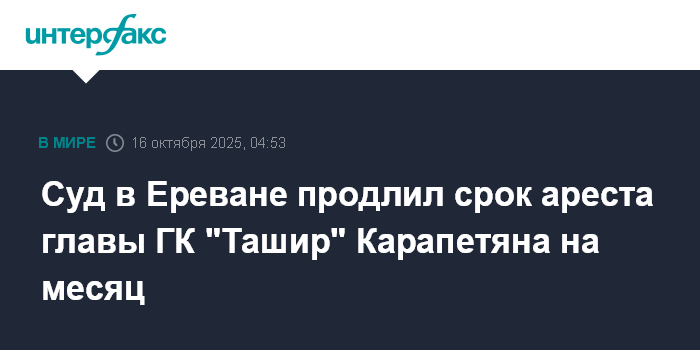 Москва. 16 октября. INTERFAX.RU - Антикоррупционный суд Армении оставил под арестом российского бизнесмена армянского происхождения, президента группы компаний "Ташир" Самвела Карапетяна.