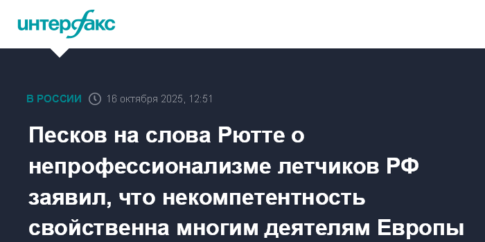 Москва. 16 октября. INTERFAX.RU - Некомпетентность характерна для многих европейских деятелей, заявил пресс-секретарь президента РФ Дмитрий Песков, комментируя высказывания генерального секретаря НАТО Марка Рютте о непрофессионализме российских летчиков и моряков.