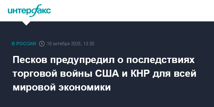 Москва. 16 октября. INTERFAX.RU - Возможная торговая война между США и КНР скажется на всей мировой экономике, заявил на брифинге пресс-секретарь президента Дмитрий Песков.