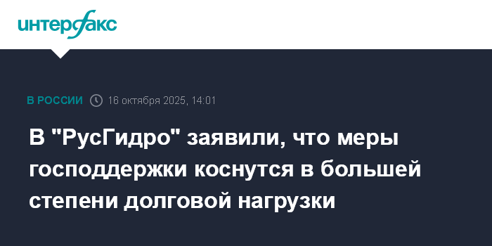 Москва. 16 октября. INTERFAX.RU - Меры поддержки "РусГидро" касаются в большей степени долговой нагрузки, срок моратория на дивиденды пока официально не определен, заявил журналистам в кулуарах РЭН-2025 член правления компании Сергей Теребулин.