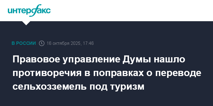 Москва. 16 октября. INTERFAX.RU - Правовое управление Госдумы представило ряд замечаний к законопроекту № 1022048-8, который упрощает перевод земель сельскохозяйственного назначения, не занятых угодьями, под объекты сельского туризма.