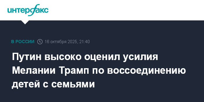 Мелания Трамп ранее в октябре сообщила о наличии у нее прямого канала коммуникаций с президентом Путиным для обсуждения состояния детей, разлученных с семьями в ходе украинского конфликта. По ее словам, Путин ответил на ее письмо, в котором поднимался этот вопрос, выразив готовность общаться с ней напрямую и описав детали о состоянии украинских детей, в настоящий момент проживающих в России. За три месяца прошли несколько встреч с участием представителей России и США по этому вопросу. По ее словам, за последние 24 часа восемь детей вернулись в свои семьи.