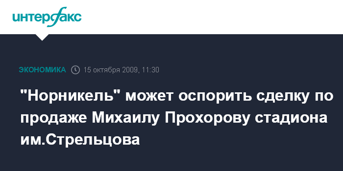 Москва. 15 октября. INTERFAX.RU - ГМК "Норильский никель" может оспорить в суде сделку, в результате которой бывший гендиректор и совладелец компании Михаил Прохоров получил контроль над футбольным стадионом им. Эдуарда Стрельцова, на котором играет принадлежащий "Норникелю" футбольный клуб "Москва".