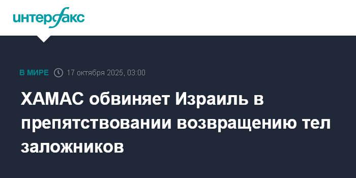 Москва. 17 октября. INTERFAX.RU - Возвращение тел оставшихся израильских заложников может потребовать времени, поскольку они находятся в туннелях и под обломками зданий, разрушенных Армией обороны Израиля; для извлечения тел требуется оборудование, ввоз которого блокирует израильское правительство, заявили в ХАМАС.