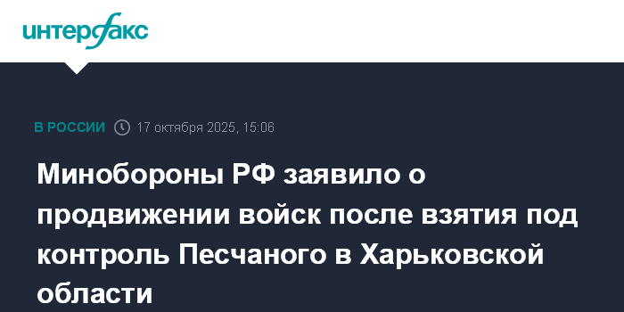 Москва. 17 октября. INTERFAX.RU - Группировка "Запад" продвигается вперед после взятия под контроль села Песчаное в Харьковской области, сообщило Минобороны РФ в пятницу.