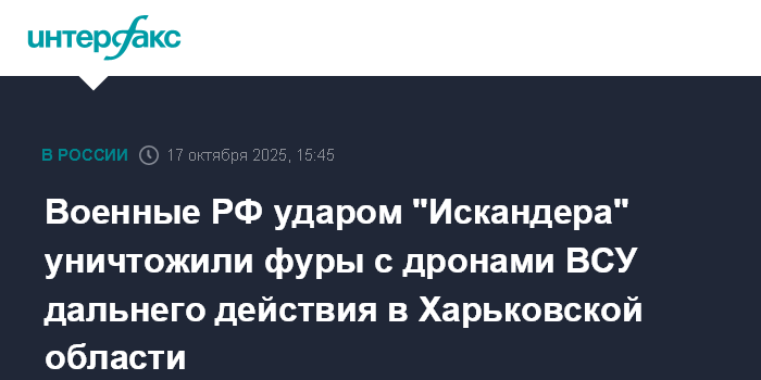 Москва. 17 октября. INTERFAX.RU - Российские военные сообщили, что нанесен удар ракетным комплексом "Искандер" по месту запуска беспилотников ВСУ и перевозившим их грузовым автомобилям в районе населенного пункта Мартовое (50 км восточнее Харькова).