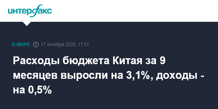 Москва. 17 октября. INTERFAX.RU - Доходы бюджета Китая в январе-сентябре 2025 года выросли на 0,5% относительно того же периода прошлого года и составили 16,39 трлн юаней ($2,31 трлн), сообщило министерство финансов страны.