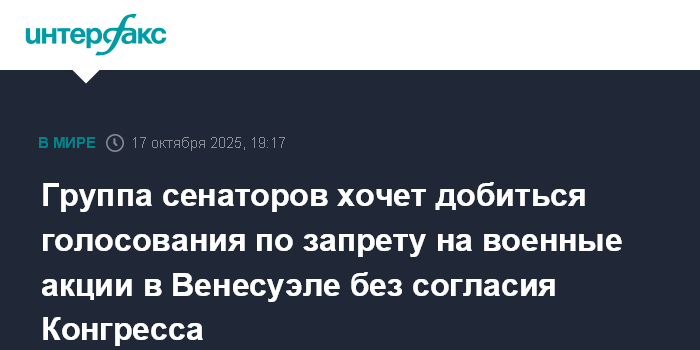 Москва. 17 октября. INTERFAX.RU - Двухпартийная группа в Сенате США намерена вынести на голосование законопроект, который должен не позволить стране участвовать в каких-либо военных акциях в Венесуэле без позволения Конгресса, сообщает в пятницу The New York Times (NYT).