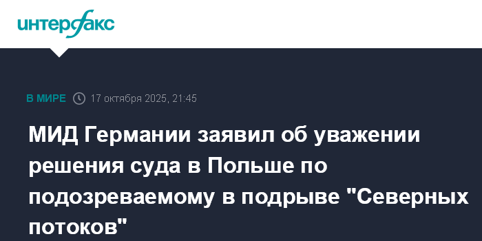 Москва. 17 октября. INTERFAX.RU - Министр иностранных дел Германии Йохан Вадефюль заявил, что уважает решение польского суда, отказавшего в экстрадиции в Германию украинца, который подозревается в подрыве газопроводов "Северный поток".