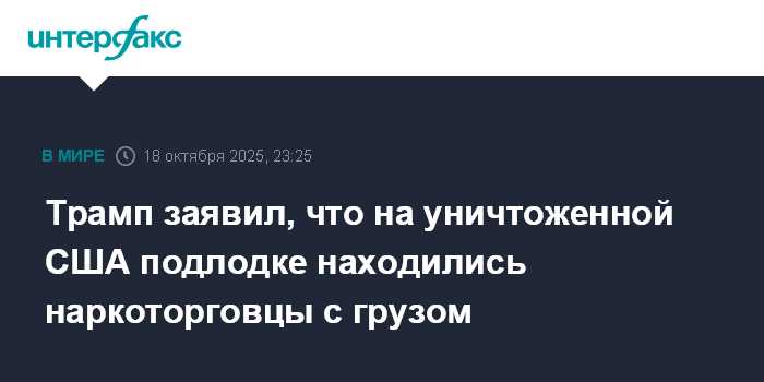 Москва. 18 октября. INTERFAX.RU - На подлодке, по которой ранее на этой неделе нанесли удар американские военные, находились известные наркоторговцы, перевозившие фентанил в больших количествах, заявил в субботу президент США Дональд Трамп.