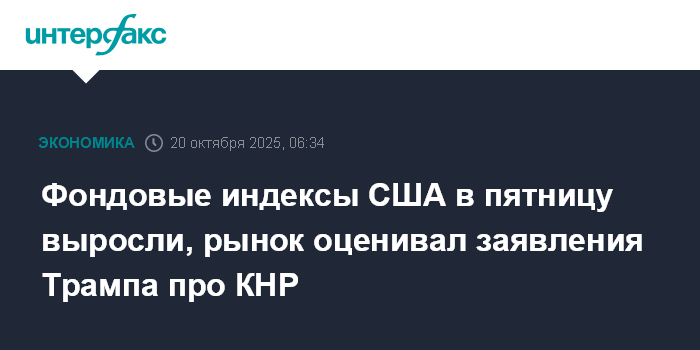 Москва. 20 октября. INTERFAX.RU - Американские фондовые индексы выросли на фоне позитивной реакции инвесторов на заявления президента США Дональда Трампа, которые смягчили опасения относительно дальнейшей эскалации торговой войны с Китаем, сообщает Trading Economics.