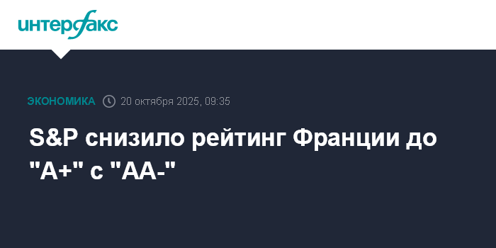 Москва. 20 октября. INTERFAX.RU - Международное рейтинговое агентство S&P Global Ratings снизило долгосрочные суверенные кредитные рейтинги Франции в иностранной и национальной валютах до "A+" с "AA-".