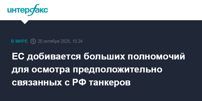 Москва. 20 октября. INTERFAX.RU - Евросоюз намеревается расширить возможности государств союза в отношении досмотра танкеров, которые, по мнению Евросоюза, связаны с Россией. Об этом сообщает Politiсo со ссылкой на оказавшийся в его распоряжении документ Европейской службы внешних действий (EEAS).