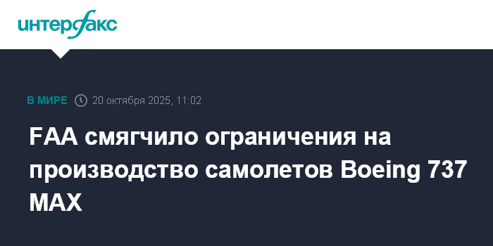 Москва. 20 октября. INTERFAX.RU - Федеральное управление гражданской авиации США (Federal Aviation Administration, FAA) смягчило ограничения по производству компанией Boeing Co. самолетов 737 MAX, подняв "производственный потолок" до 42 единиц с 38.