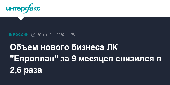 Объем нового бизнеса ЛК "Европлан" за 9 месяцев снизился в 2,6 раза