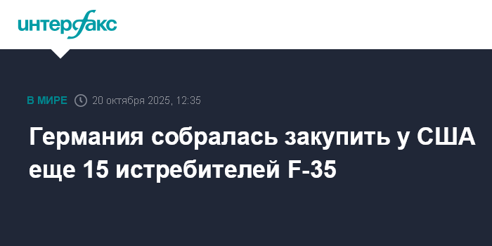 Москва. 20 октября. INTERFAX.RU - Германия намерена приобрести у США еще 15 истребителей-бомбардировщиков F-35, сообщает в понедельник журнал Der Spiegel со ссылкой на источник.