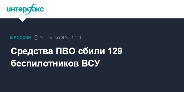 Москва. 20 октября. INTERFAX.RU - Российские военные сообщили, что средства ПВО за сутки сбили 129 украинских беспилотников самолетного типа.