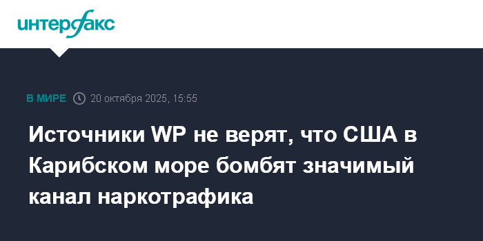 Москва. 20 октября. INTERFAX.RU - Чиновники в США и других высказывают сомнения в том, что целью американских военных в ходе кампании против наркотрафика в Карибском море действительно является крупный канал поставок наркотиков в США, пишет The Washington Post со ссылкой на источники.