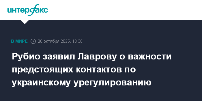 Москва. 20 октября. INTERFAX.RU - Госсекретарь США Марко Рубио и глава МИД России Сергей Лавров обсудили по телефону предстоящие контакты между Москвой и Вашингтоном для урегулирования конфликта на Украине, сообщил Госдепартамент.