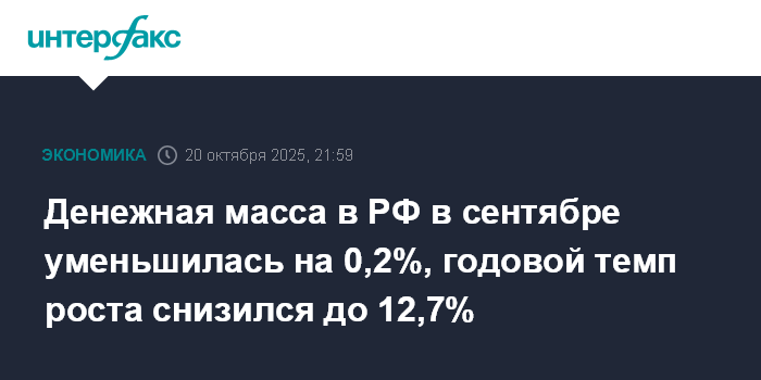 Годовой темп прироста денежной массы на 1 октября снизился до 12,7% после 14,4% на 1 сентября. Денежная масса в январе-сентябре 2025 года увеличилась на 4 трлн 9 млрд рублей, или на 3,4%.