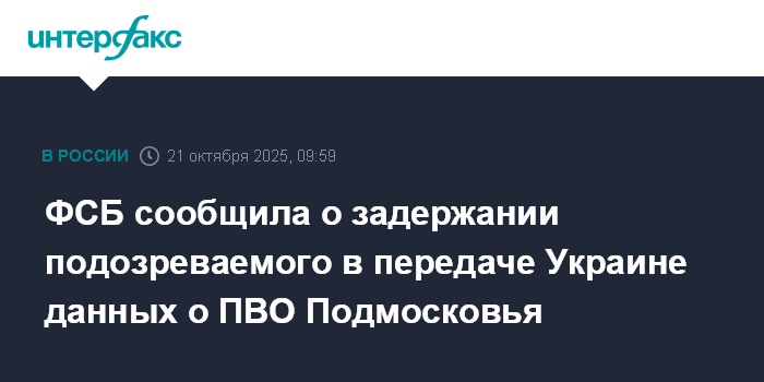 Москва. 21 октября. INTERFAX.RU - ФСБ сообщила о задержании в Москве россиянина, подозреваемого в передаче Украине сведений о дислокации средств ПВО и иных объектов Минобороны РФ на территории Московской области и Краснодарского края.