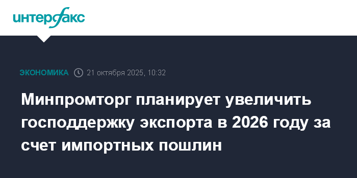 Москва. 21 октября. INTERFAX.RU - Минпромторг РФ планирует увеличить объем господдержки экспорта в 2026 году относительно заложенных в проект федерального бюджета средств за счёт растущих поступлений от импортных пошлин, взимаемых с товаров из недружественных стран, сообщил замглавы министерства Роман Чекушов.