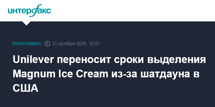 Москва. 21 октября. INTERFAX.RU - Unilever переносит сроки выделения бизнеса по производству мороженого Magnum Ice Cream Co. из-за продолжающегося шатдауна в США.