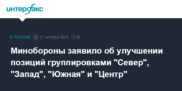 Москва. 21 октября. INTERFAX.RU - Войска группировок "Север", Запад", "Южная" и "Центр" за минувшие сутки улучшили позиции, "Восток" продвигается вглубь обороны ВСУ, сообщило министерство обороны РФ во вторник.