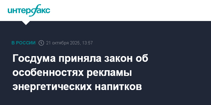Москва. 21 октября. INTERFAX.RU - Госдума приняла во втором и в третьем чтении закон № 888942-8 об особенностях рекламы безалкогольных тонизирующих напитков, в том числе энергетических.