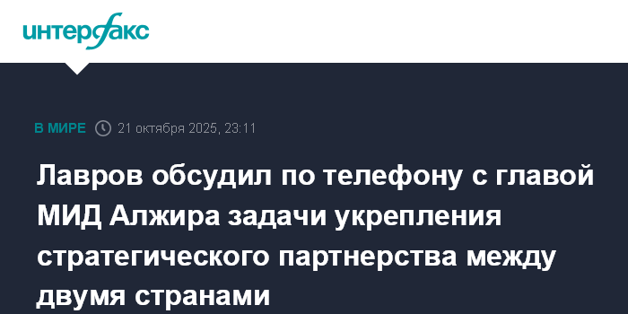 Москва. 21 октября. INTERFAX.RU - Министр иностранных дел РФ Сергей Лавров обсудил по телефону с госминистром, главой МИД Алжира Ахмедом Аттафом вопросы сотрудничества между двумя странами, сообщает МИД России.