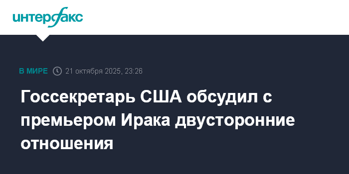 Москва. 21 октября. INTERFAX.RU - Госсекретарь США Марко Рубио в ходе телефонного разговора с премьером Ирака Мухаммедом Шиа аль-Судани обсудил отношения в сфере торговли, сообщили во вторник в Госдепартаменте.