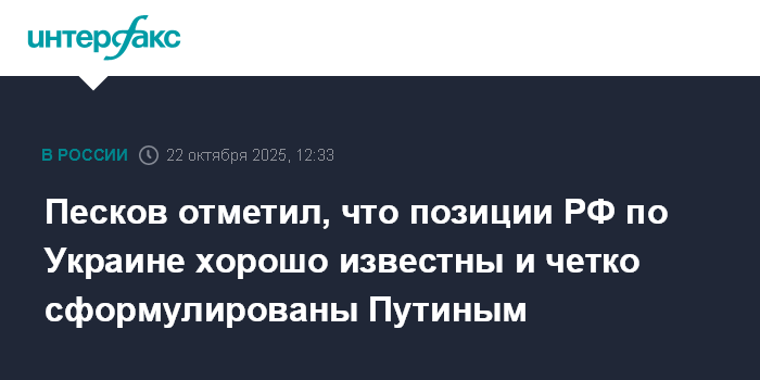 Москва. 22 октября. INTERFAX.RU - Позиции России по украинскому вопросу всем хорошо известны, они четко сформулированы президентом РФ Владимиром Путиным, сообщил его пресс-секретарь Дмитрий Песков.