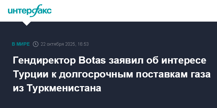 Москва. 22 октября. INTERFAX.RU - Турция, в марте начавшая получать газ из Туркменистана, заинтересована в долгосрочных и крупномасштабных поставках туркменского газа, заявил генеральный директор турецкой госкомпании Botas Абдулвахит Фидан в ходе международной конференции "Нефть и газ Туркменистана - OGT 2025". Об этом сообщает агентство News Central Asia.