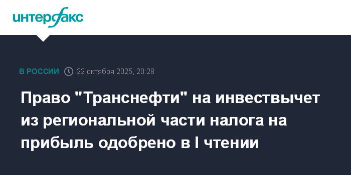 Москва. 22 октября. INTERFAX.RU - Госдума приняла в первом чтении законопроект, который позволяет "Транснефти" уменьшать региональную часть налога на прибыль (17%) через механизм инвестиционного налогового вычета (ИНВ) и предлагает распространить эту норму на правоотношения, возникшие с 1 января 2025 года, то есть с момента, когда компания этого права лишилась.