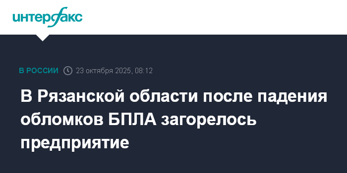Москва. 23 октября. INTERFAX.RU - В Рязанской области из-за падения обломков одного из сбитых ночью беспилотников начался пожар на предприятии, сообщил в Telegram губернатор региона Павел Малков.