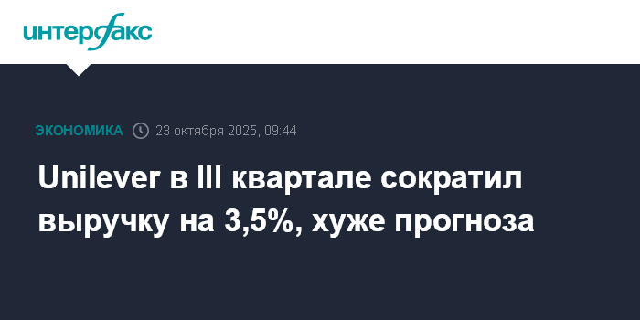 Москва. 23 октября. INTERFAX.RU - Unilever, один из ведущих мировых поставщиков товаров повседневного спроса, сократил выручку в третьем квартале на 3,5% в годовом выражении.