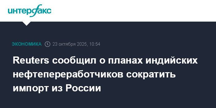 Москва. 23 октября. INTERFAX.RU - Индийские нефтепереработчики готовятся резко сократить импорт нефти из России после новых санкций США против двух крупнейших российских нефтяных компаний - "Роснефти" и "ЛУКОЙЛа", сообщает Reuters со ссылкой на источники.