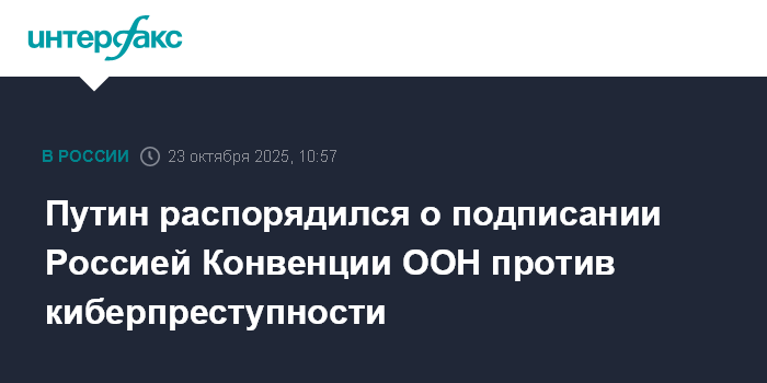 Москва. 23 октября. INTERFAX.RU - Президент РФ Владимир Путин распорядился подписать Конвенцию ООН против киберпреступности. Распоряжение президента опубликовано на портале правовой информации.